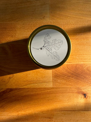 Inspired by the dense Michigan forest after a fresh rain. Oak + moss combines a strong base of earthy cedarwood with rustic oak, soft moss, and light greenery to capture the wonder of adventure. Item Details: - 6oz Gold Metal Tin - Dimensions: 2" tall x 2.75" wide - Burn Time: 25hrs
