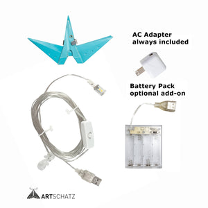 Each handmade paper star comes with a pre-installed clear 12-ft cable, an energy saving LED bulb, an on/off switch, and a 5V AC Adapter.